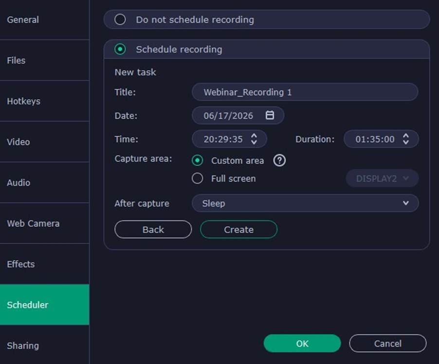 Scheduled recording was absent for quite a while, but Movavi eventually brought it back. Apart from just setting the date and starting time, you’re able to add a specific time period, schedule only a part or full screen recording, and pick what action should be taken after it ends (turning off PC, putting it to sleep, or do nothing).