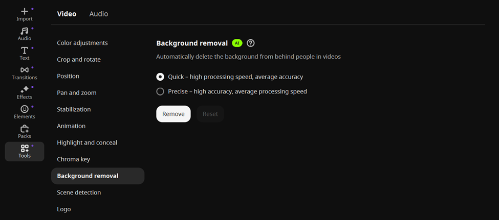 Movavi’s AI background removal has been around for a while now, but it’s still one of the features that instantly feels next-gen when you try it. Instead of messing with green screens, you drop a clip on the timeline, use the background removal tool, and let the AI cut your subject out automatically. The feature arrived as part of a major AI push in version 23, where Movavi introduced AI-powered background removal and AI noise removal in one go.