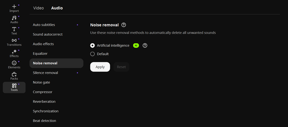 Audio cleanup is another area where Movavi Video Editor leans on AI. AI noise removal was rolled out alongside background removal, aimed at cutting traffic hum, wind, and other background sounds automatically.