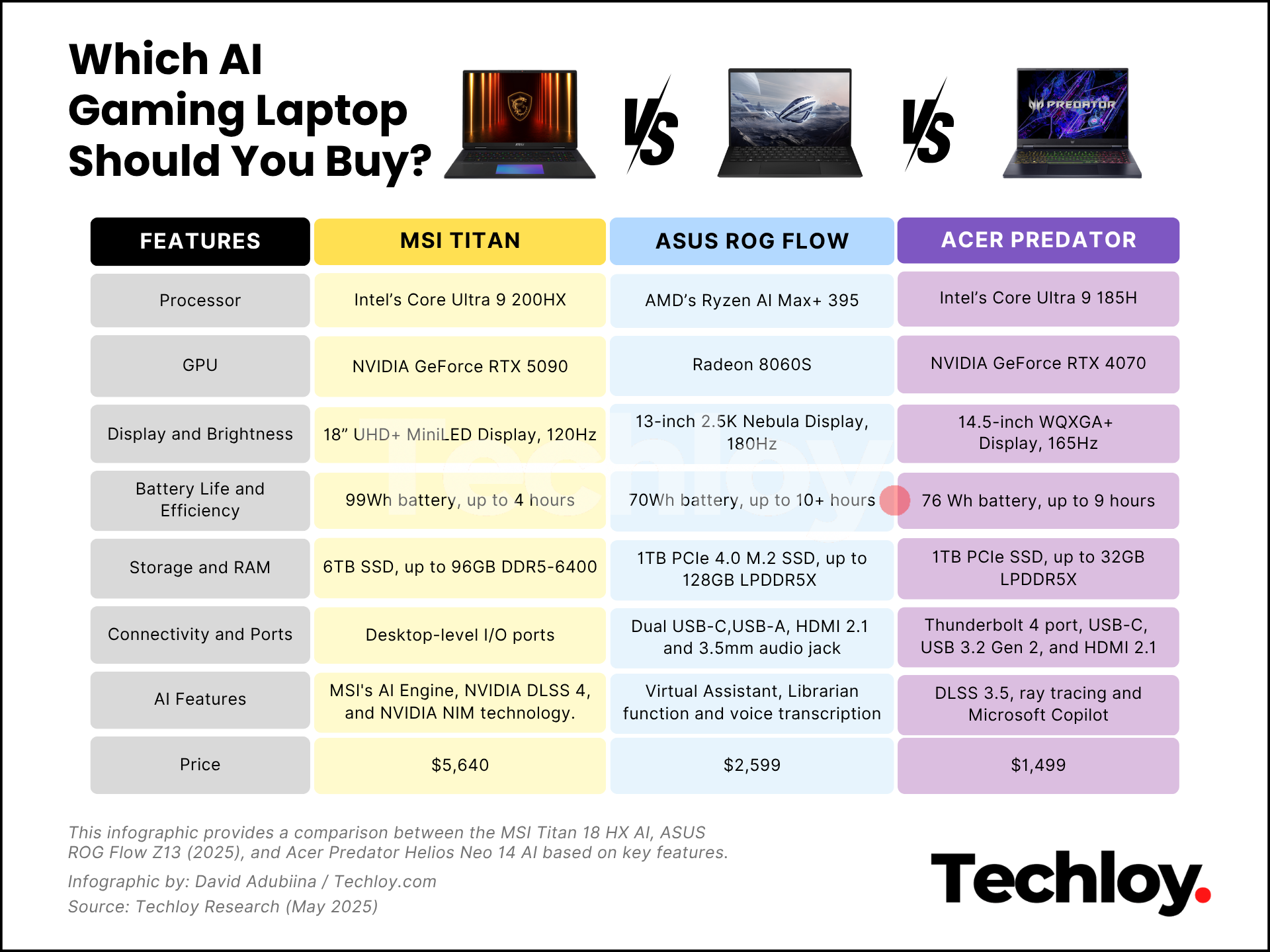 On the other end, the ASUS ROG Flow Z13 (2025) uses AMD’s Ryzen AI Max+ 395 paired with Radeon 8060S integrated graphics. It’s a sleek hybrid built for efficiency and portability rather than brute raw power like the Titan.