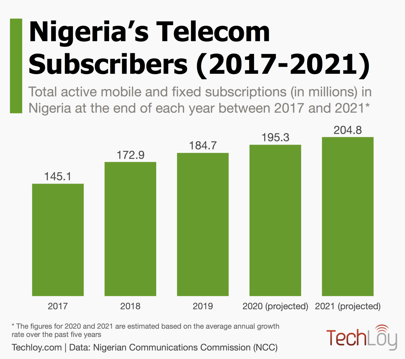 In this Techloy chart, we highlight the growth and estimated growth of active telecom subscriptions in the country from 2017 to 2021, which is expected to cross the 200 million mark by 2021, according to Techloy projections, based on the average annual growth rate over the past five years.