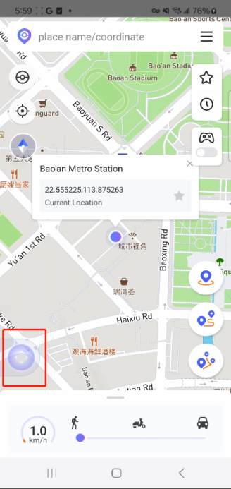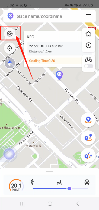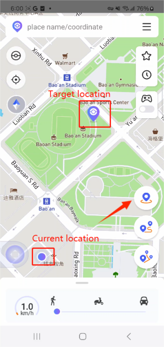 Open the app and use the pin to select your destination or enter the address. Then tap the "Target Location" icon to update your current location to the new address.