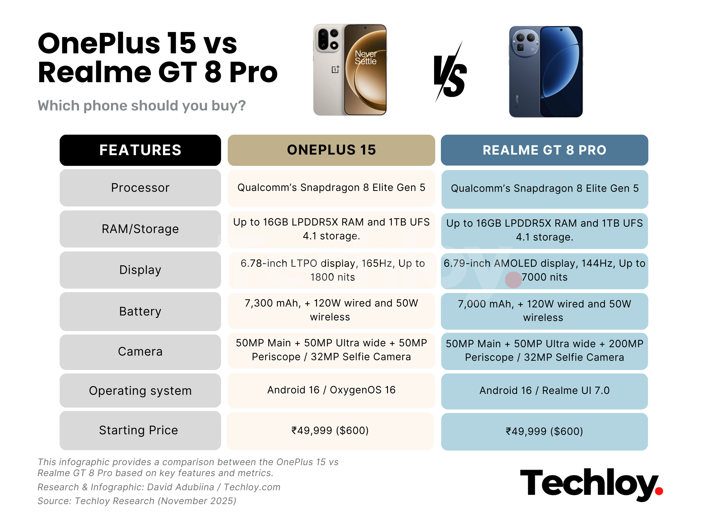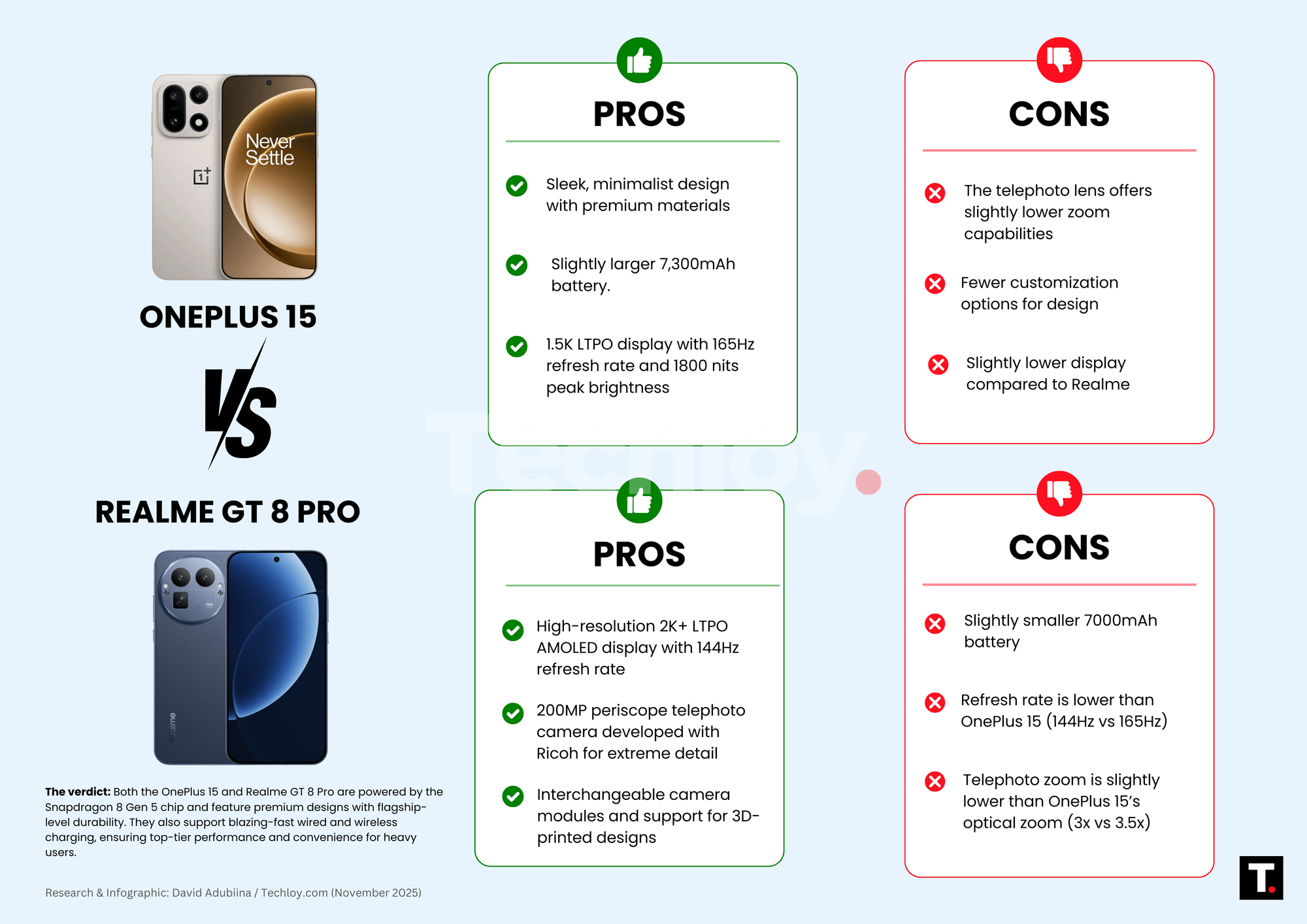 Choosing between the two ultimately depends on what you value most in a flagship device. If you prefer a polished, all-around performer with a focus on design and smooth performance, the OnePlus 15 is a strong pick. If customization, extreme camera capabilities, and a higher-resolution display are your priorities, the Realme GT 8 Pro may be the better choice.