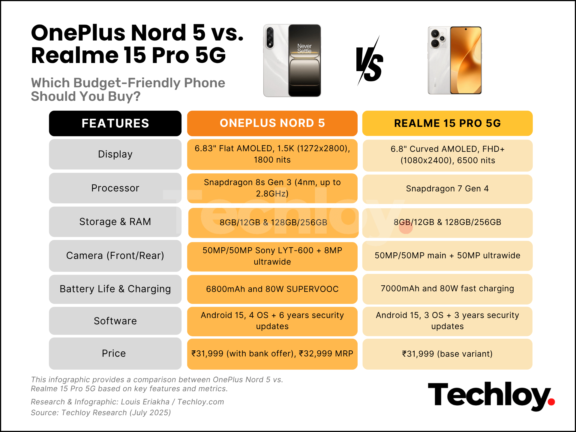Both the OnePlus Nord 5 and Realme 15 Pro 5G start at ₹31,999 for the 8GB + 128GB base variant. For OnePlus, this price includes an instant bank discount, while the MRP sits slightly higher at ₹32,999.