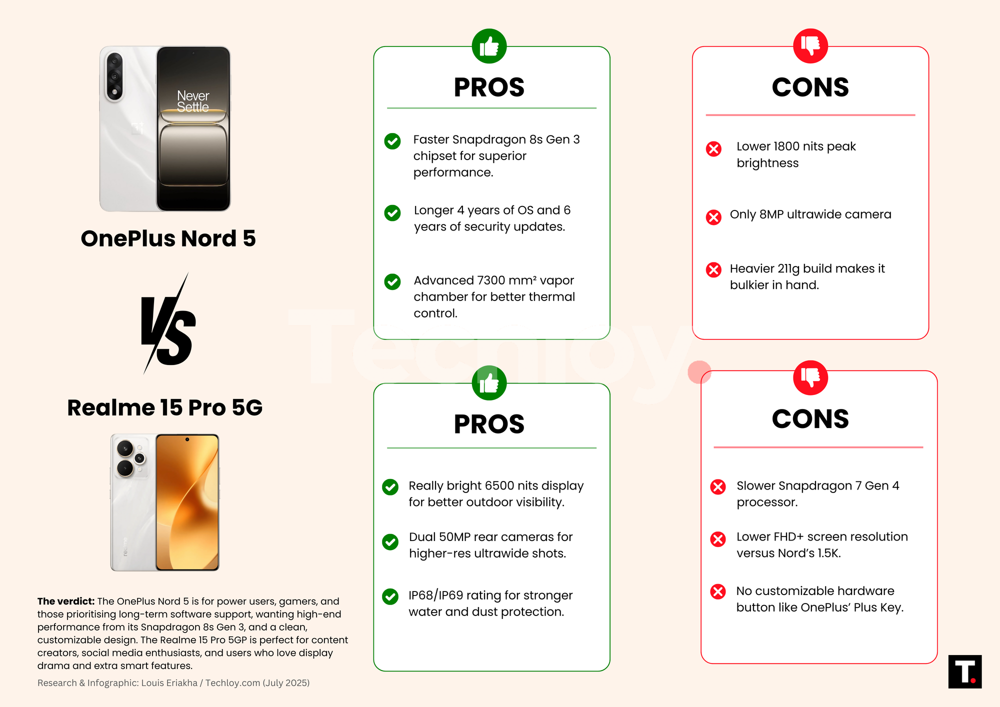 The OnePlus Nord 5 and Realme 15 Pro 5G land in nearly the same price bracket and promise impressive cameras, powerful performance, and long battery life. On paper, they’re neck and neck. But peel back the spec sheets, and each one leans into a slightly different philosophy. One favors clean power and long-term polish, while the other pushes bold design and all-out feature stacking.