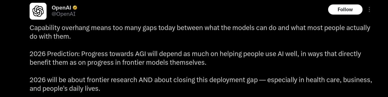 OpenAI just changed the conversation around artificial general intelligence. In a post shared Tuesday, December 23, the company stated that reaching AGI in 2026 will depend as much on helping people use AI effectively as on advancing frontier models themselves. The core concept is “capability overhang” the gap between what AI models can already accomplish and what most users actually do with them.
