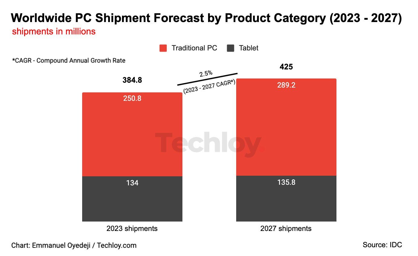 But, IDC expects the Commercial Segment to help the market rebound in 2024 with global volumes reaching 403.1 million during the year and growing to 425 million by the end of 2027 as seen in the Techloy chart below.
