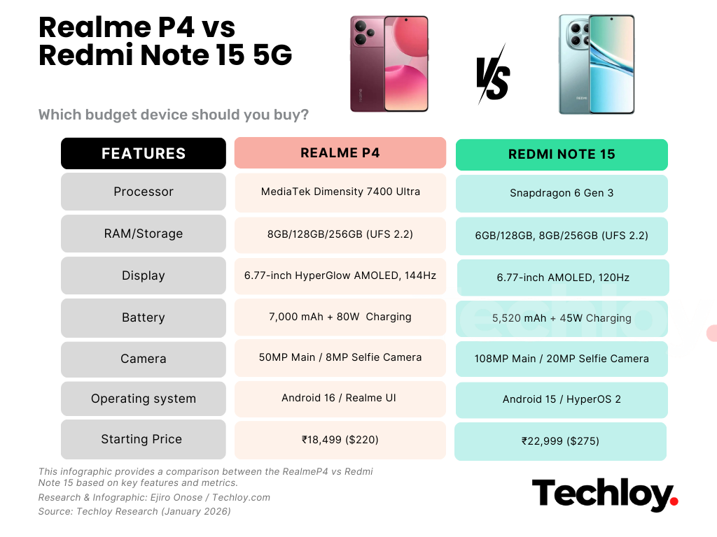 Here is a comprehensive comparison of the Realme P4 and the Redmi Note 15.