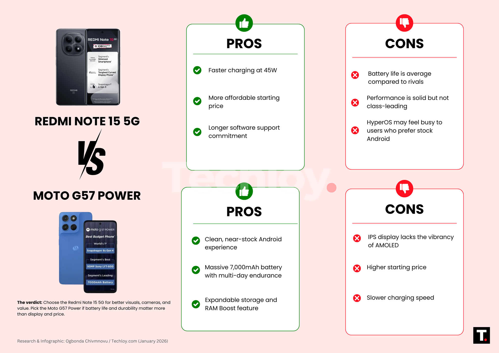 The choice between the Redmi Note 15 5G and the Moto G57 Power depends on what you need most. The Redmi Note 15 5G is better suited for users who want a brighter display, stronger cameras, longer software support, and a lower price. It’s the better pick for media, social apps, and everyday use on a budget.