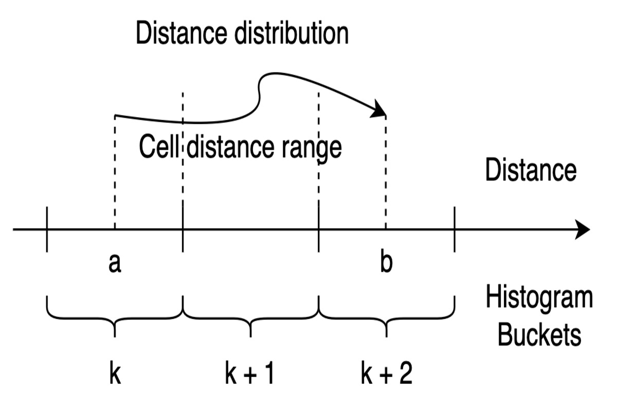 The illustration below explains the process of SDH computation using bucket-based distance ranges to calculate inter-cell distributions: