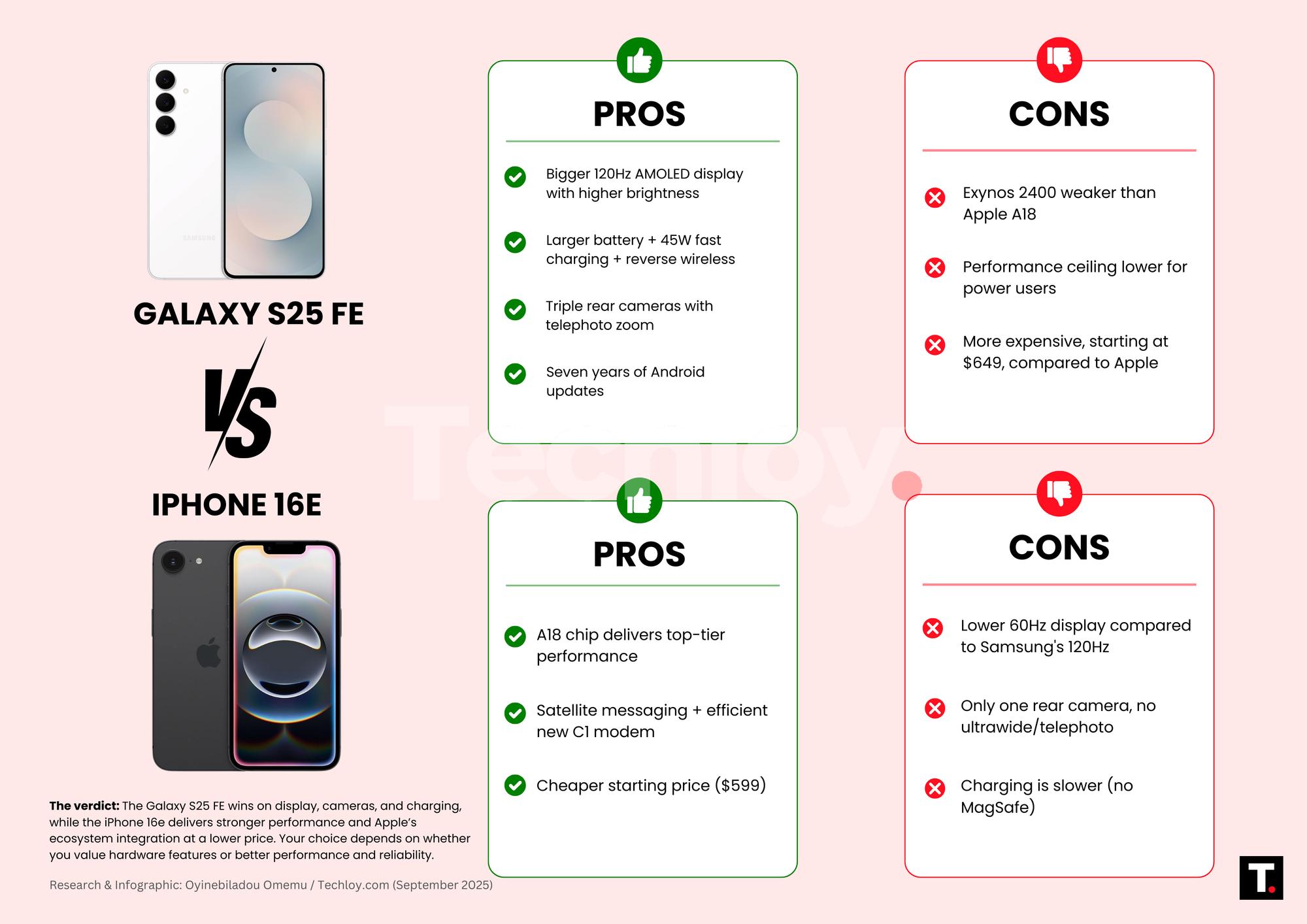 On the other hand, Apple’s iPhone 16e is built for those who value performance, future-proof connectivity, and the seamless Apple experience at a friendlier price. Neither is a wrong choice; it all boils down to whether you want Samsung’s hardware-heavy approach or Apple’s ecosystem.
