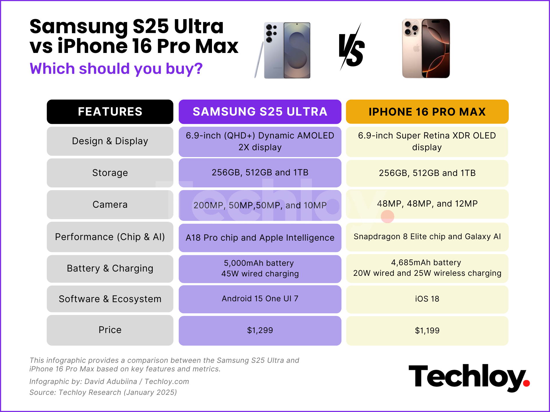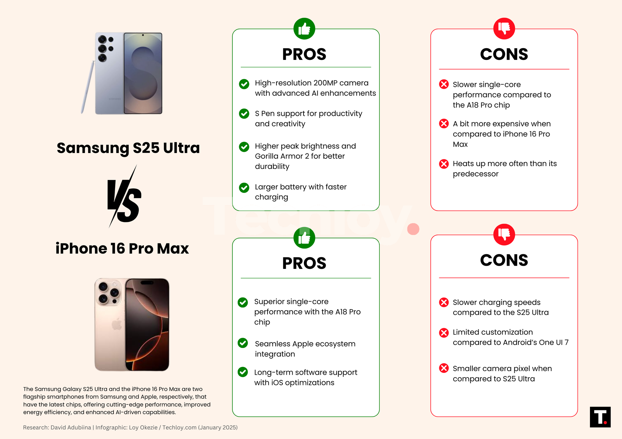 Both the Samsung Galaxy S25 Ultra and the iPhone 16 Pro Max stand at the pinnacle of smartphone innovation. If you prioritize an advanced camera system, faster charging, and productivity features like the S Pen and DeX, the S25 Ultra is the better pick.