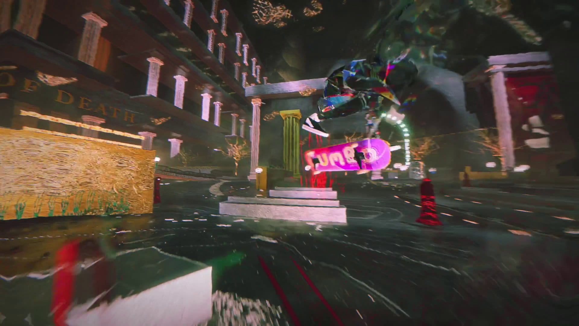 Skate Story's gameplay controls are simple but deliberate. One button triggers an ollie, while a shoulder button shapes tricks into kickflips, heelflips, pop shuvits, and other familiar moves. Animations focus heavily on precision, highlighting foot placement, posture, and weight shifts. Falls play out in a first-person blur that mimics the disorientation of real skating, adding a physical dimension that sits alongside the more stylized visuals.