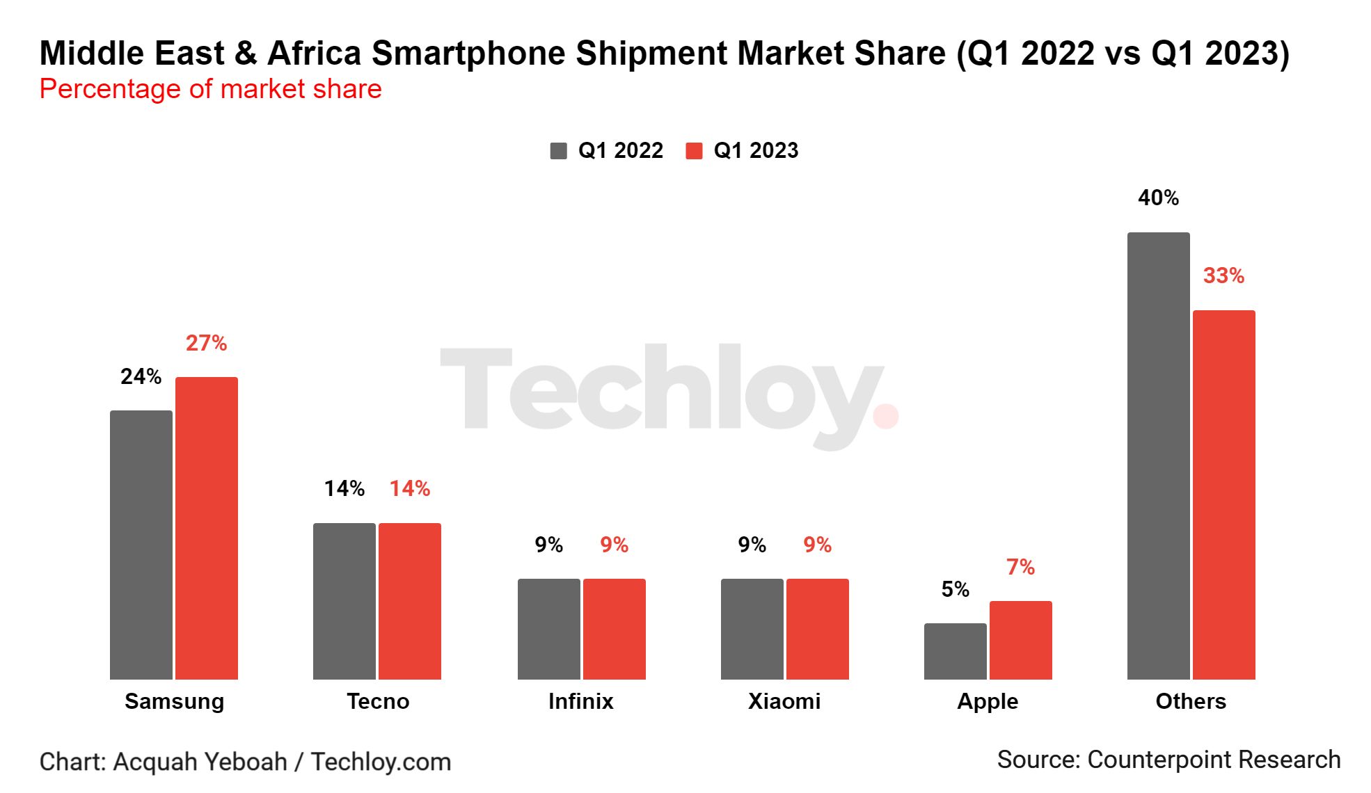 Smartphone shipments in the Middle East and Africa (MEA) region experienced a decline of 11% year-on-year and 3% quarter-on-quarter in the first quarter of 2023, reaching the lowest Q1 shipment level since 2016, according to Counterpoint.