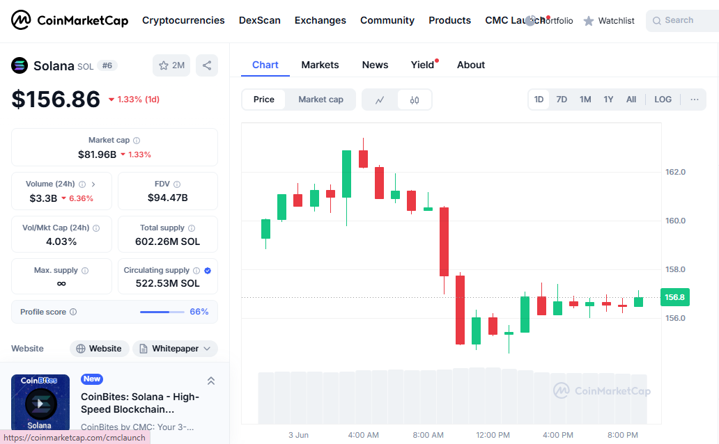 As for Solana itself, the signs are already showing up in the charts. Earlier this week, SOL saw a 7% jump, breaking above $159 with strong volume. The price briefly dipped by over 2% as the Pump.fun headlines started circulating, but quickly regained much of that ground. At the time of writing, SOL is trading at $156.5, with a total market cap of $81.74 billion and a 24-hour trading volume of $3.3 billion, per CoinMarketCap.
