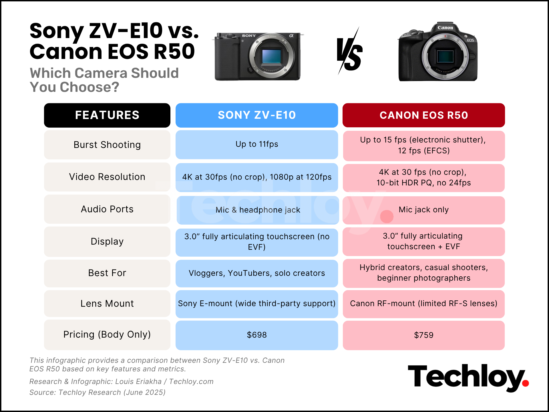 At the time of writing, the Sony ZV-E10 typically sells for around $698 (body only) or $798 with a kit lens. The Canon EOS R50 comes in at about $759 (body only) and $879 with the 18–45 mm kit lens.