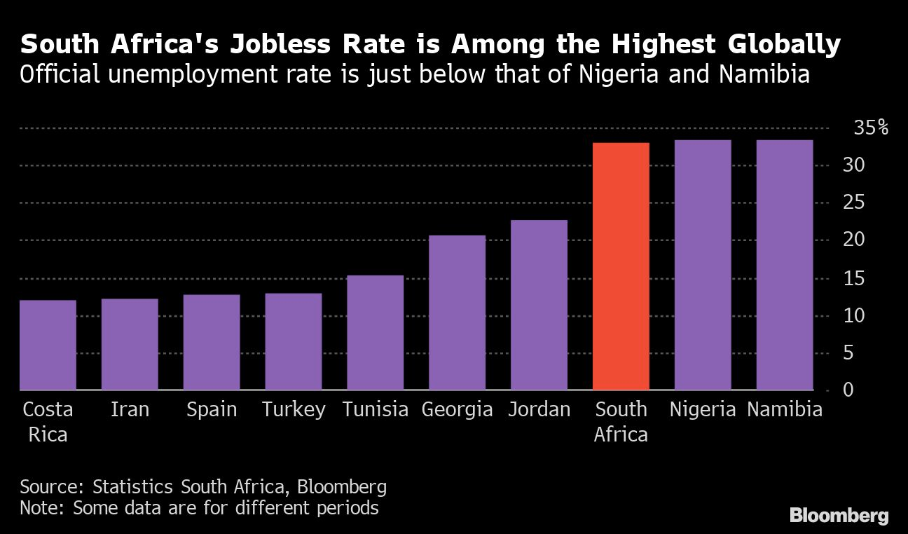 The official jobless rate in South Africa has now exceeded 20% for at least two decades. That’s largely due to sluggish economic growth, strict labour laws and bureaucratic hurdles that have weighed on the ability of local companies to hire additional workers.