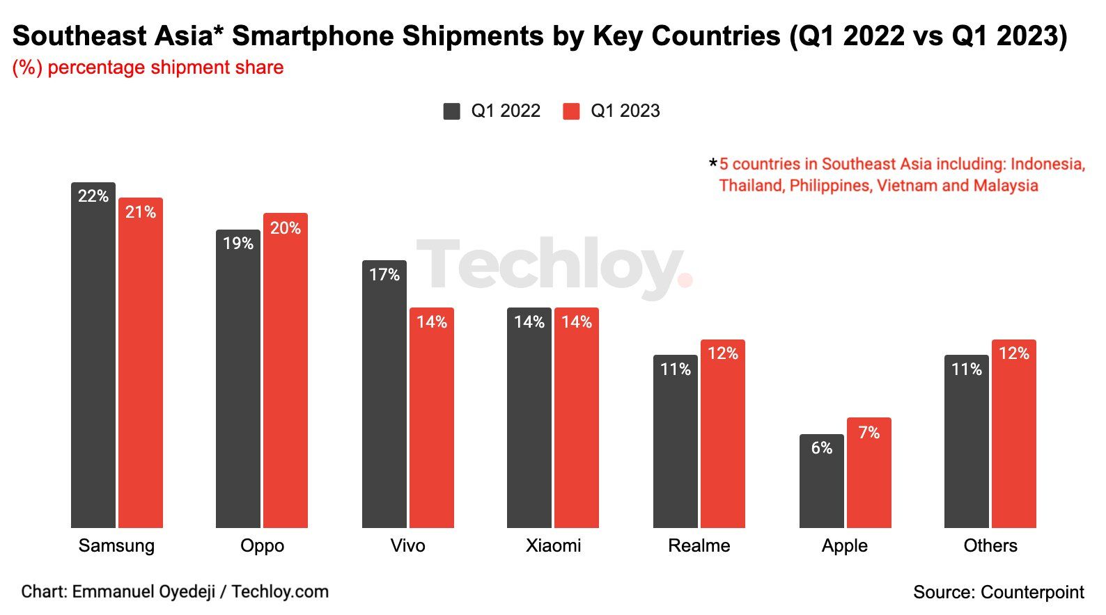 A recent report by market intelligence group Counterpoint has shown that there was a 13% decline in smartphone shipments in the five key countries in the Southeast Asia region: Indonesia, Thailand, Philippines, Vietnam, and Malaysia in Q1 2023, amid low demand and a seasonal decline that caused this decrease.