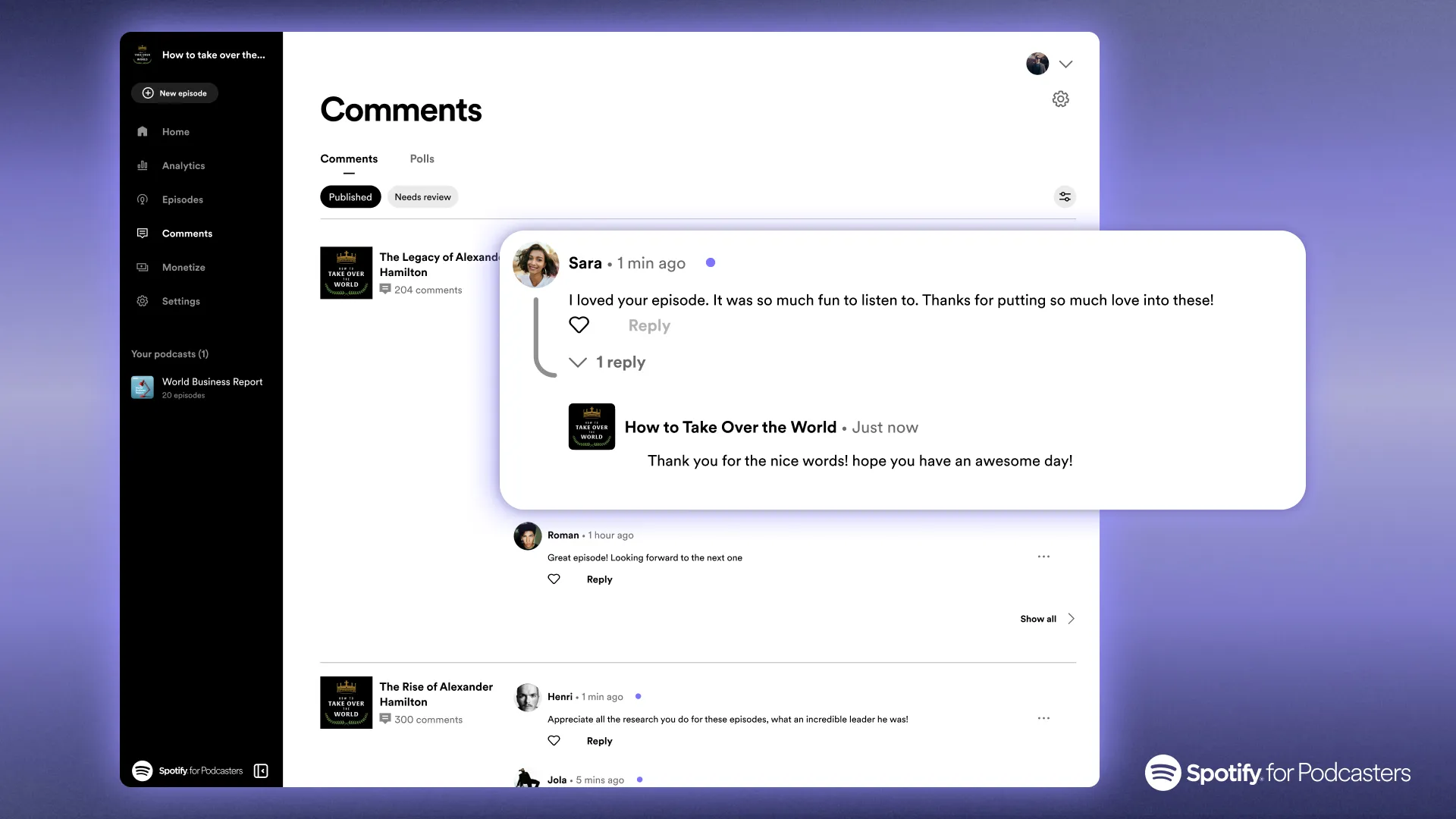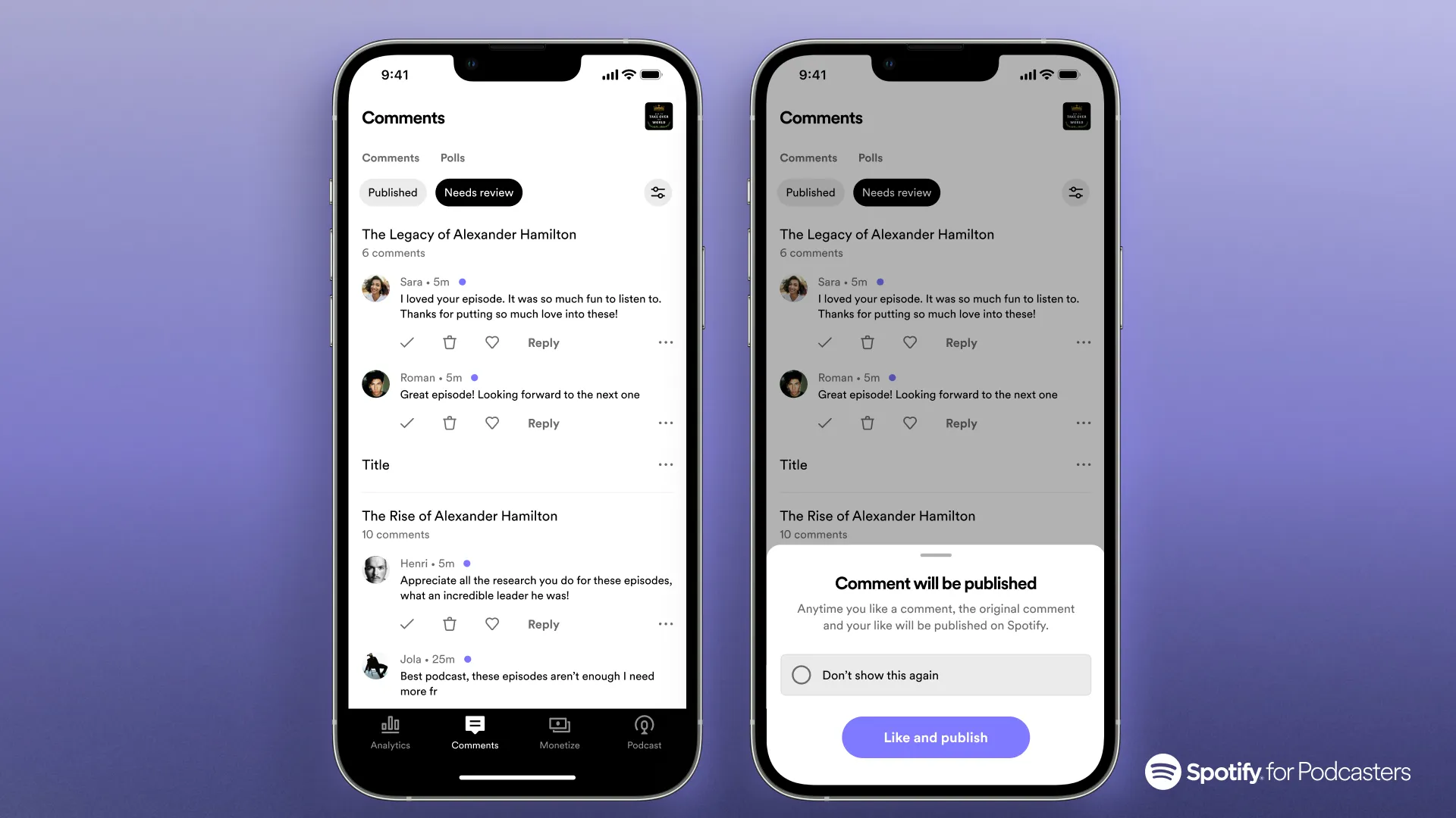 But the engagement goes both ways, Podcast creators can also now like and respond to your comments, keeping the conversation flowing. This is on top of a new Spotify for Podcasters app that enables podcasters to manage their shows – including managing their presence on Spotify, and access other insights and analytics about their audience.
