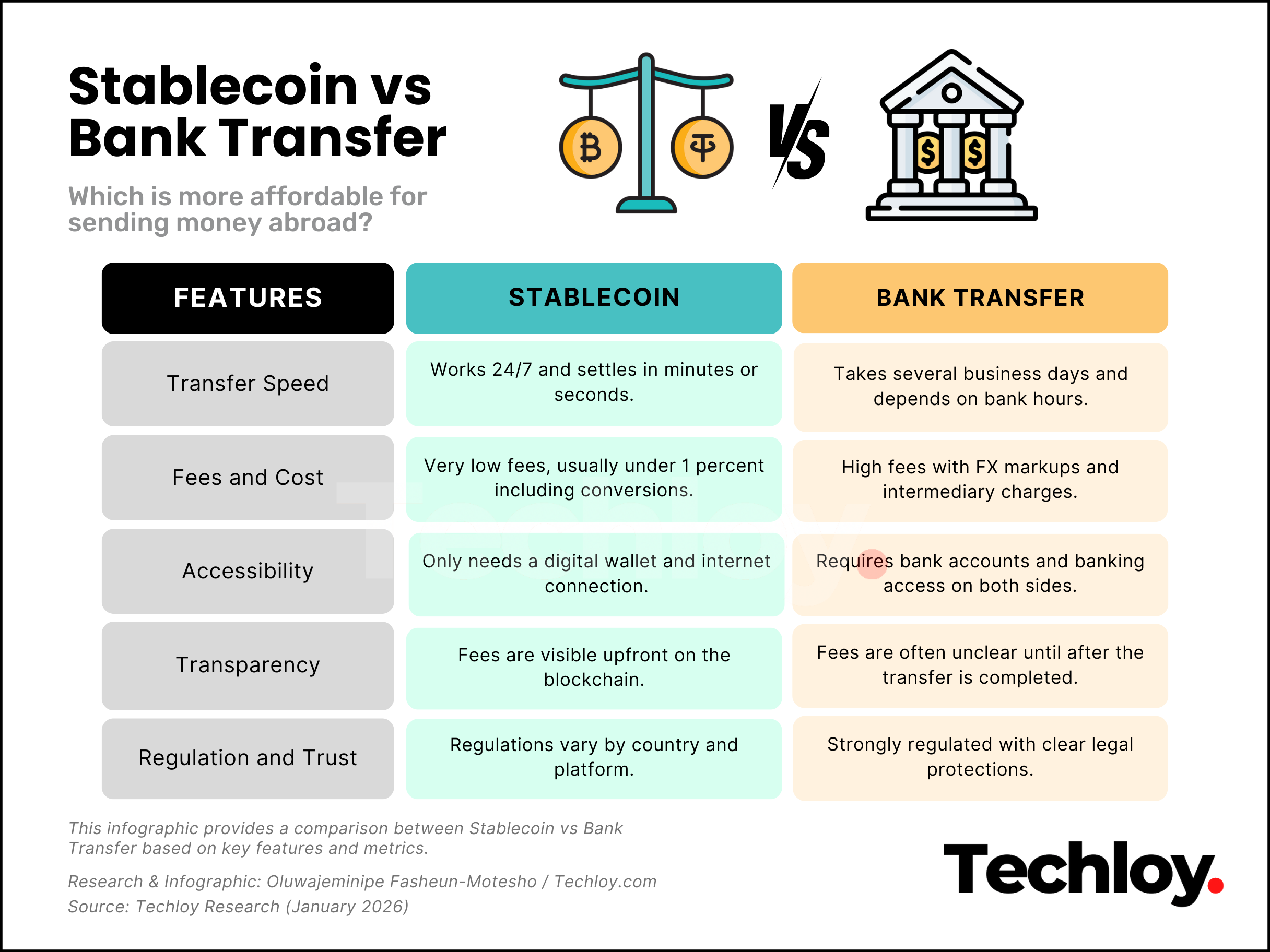 Sending money across borders used to mean bank transfers that take several days and charge high fees. Now, stablecoins —digital tokens tied to real currencies like the US dollar — offer a new way to move money internationally. People and businesses are increasingly comparing the two methods to see which one costs less and works faster.