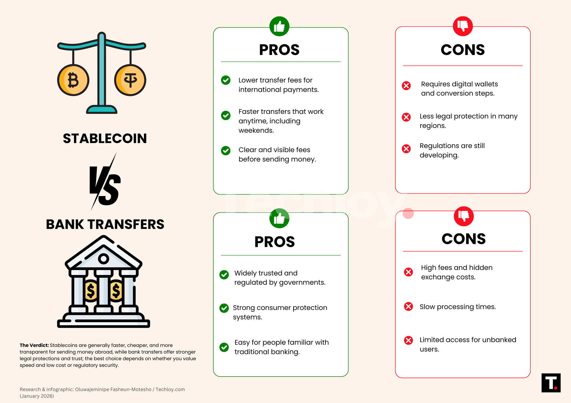 However, stablecoins require users to understand digital wallets, conversion steps, and potentially local regulations. Bank transfers remain familiar, widely accepted, and supported by financial protections, but they are often slower and more expensive.