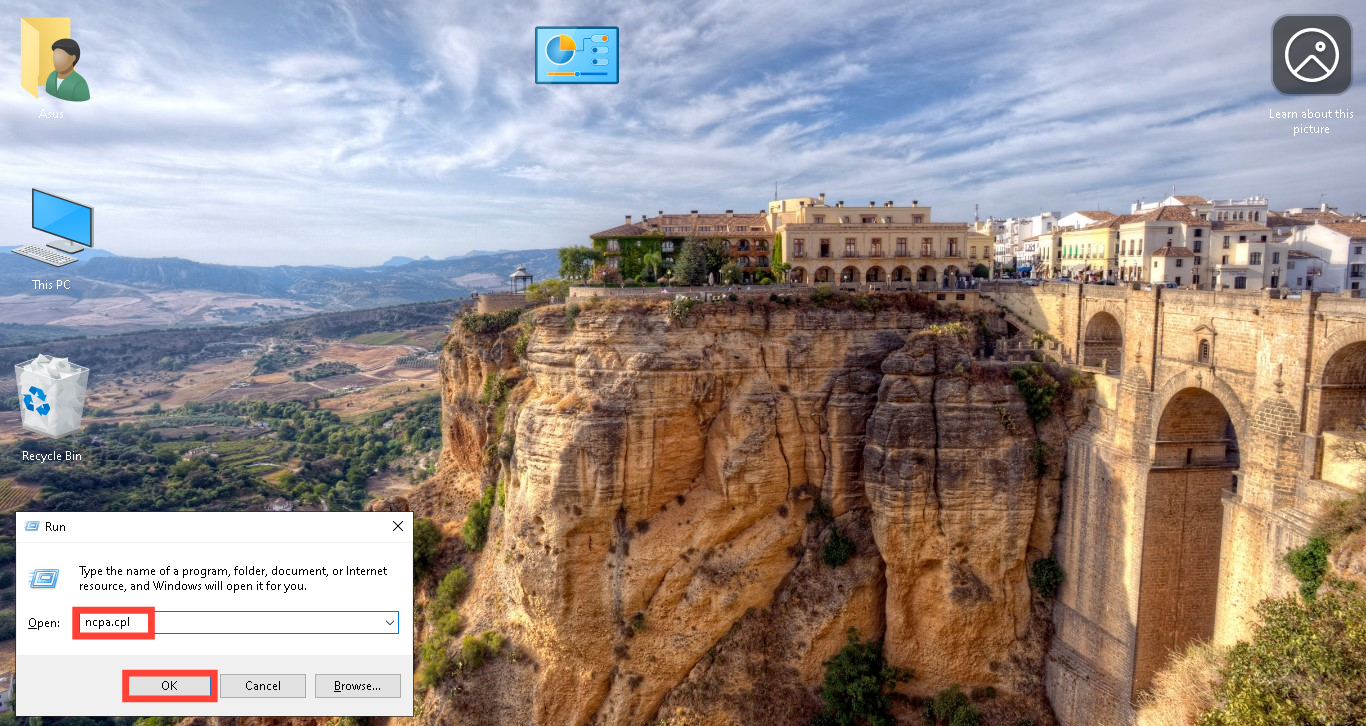 Step 1. Press Windows key + R, enter ncpa.cpl, and press Enter or "Ok."