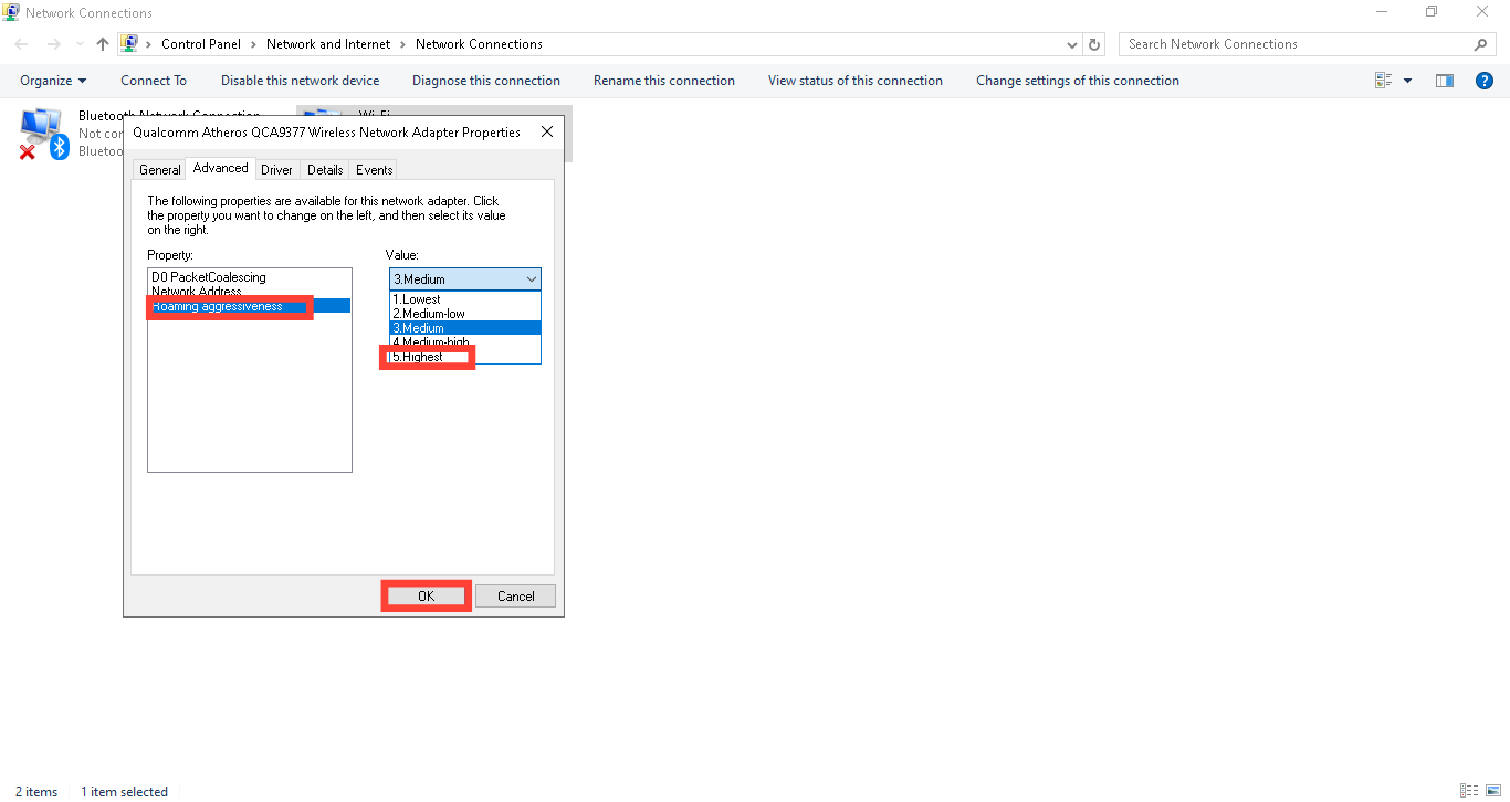 Step 4. Select the "Preferred band" if available, and choose the fastest available mode (e.g., 802.11ac). If not, select "Roaming Aggressiveness," and set it to Highest. Click "OK" to save the changes.