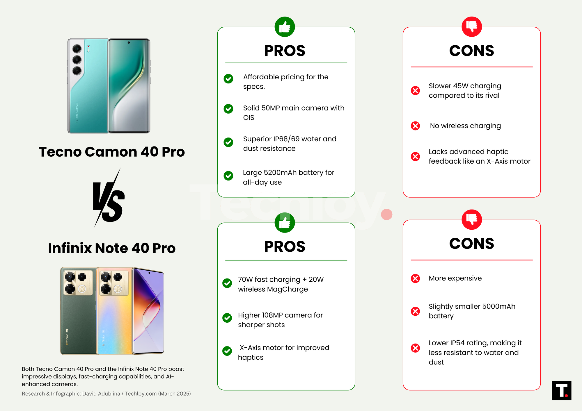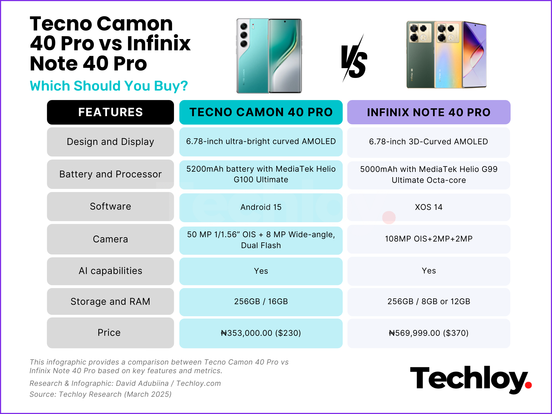 If you want great value, a premium display, and solid performance at a lower price, the Tecno Camon 40 Pro is your guy. But if you’re after faster charging, more powerful cameras, and extra premium touches, the Infinix Note 40 Pro might be worth the splurge.