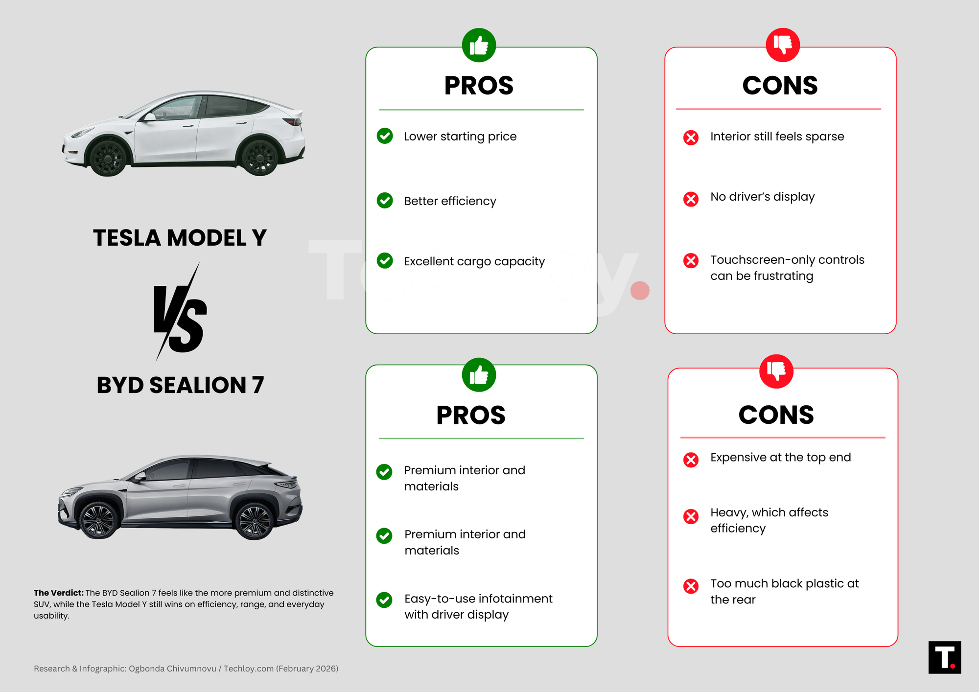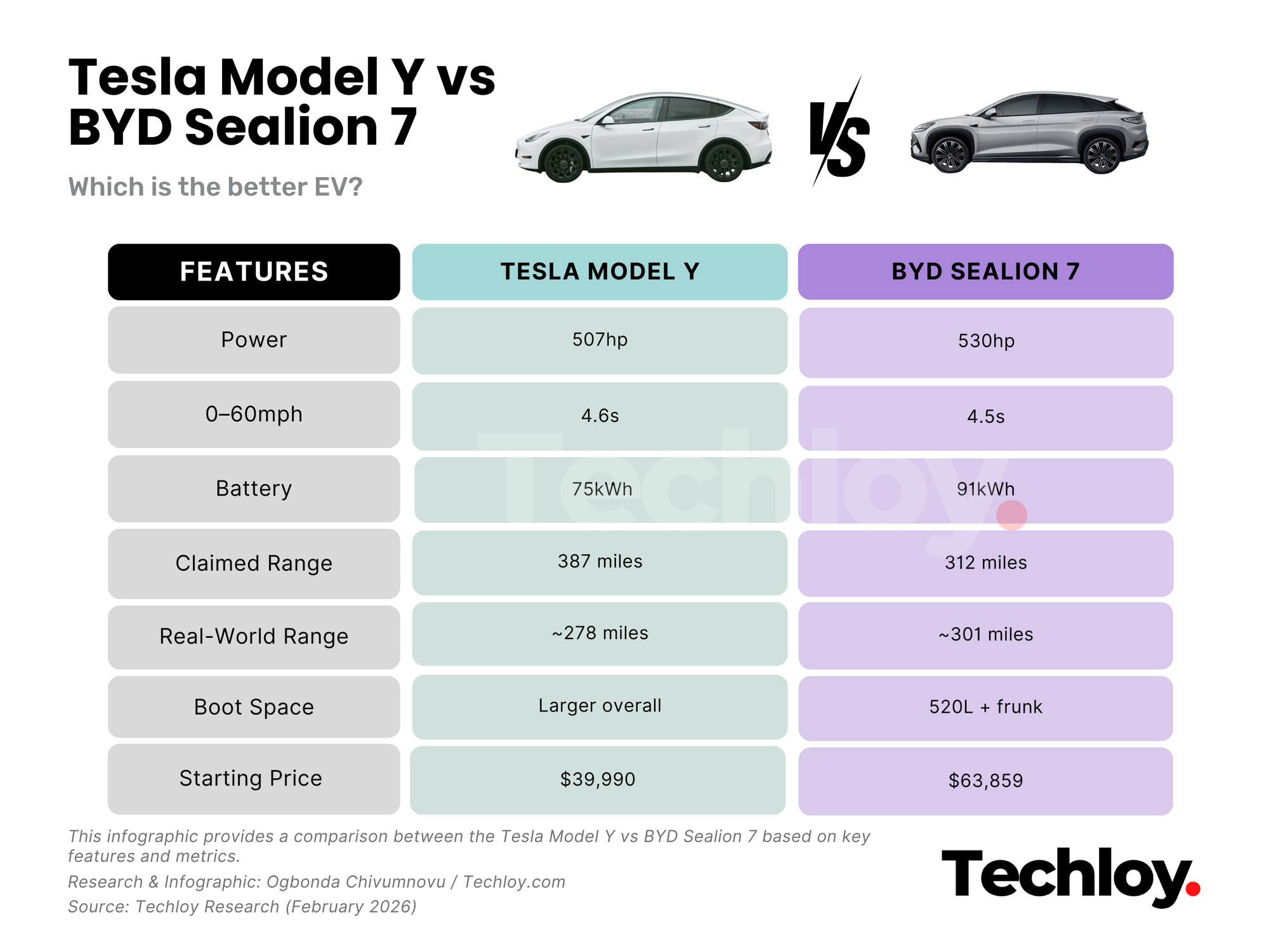 If you want a premium feel, design flair, and a long real-world range, the BYD Sealion 7 is the more complete car. If you care more about price, efficiency, and practicality, the Tesla Model Y makes a strong case.