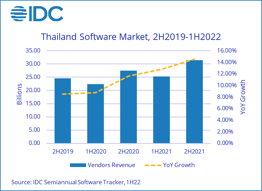 Thailand’s software market grew 20.1% year-over-year (YoY) in 1H22, accelerating from 14.5% YoY in 2H21, according to recent research numbers from the International Data Corporation (IDC).
