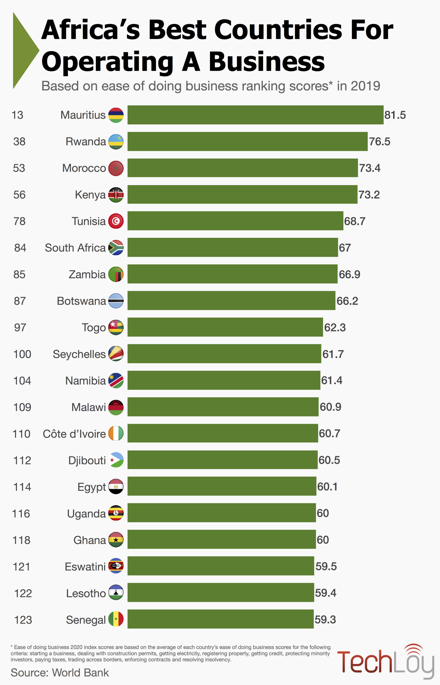 This Techloy infographic shows the African countries with the best regulations that enhance business activity, with Mauritius topping the rankings with a Doing Business score of 81.5, and ranked 13th in the world, according to the World Bank Ease of Doing Business 2020 Index.
