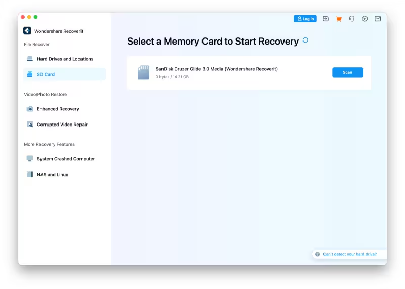 Step 1: Once you download, install, and log in to Recoverit on your Mac, launch it. Then, connect your SD card to your Mac.