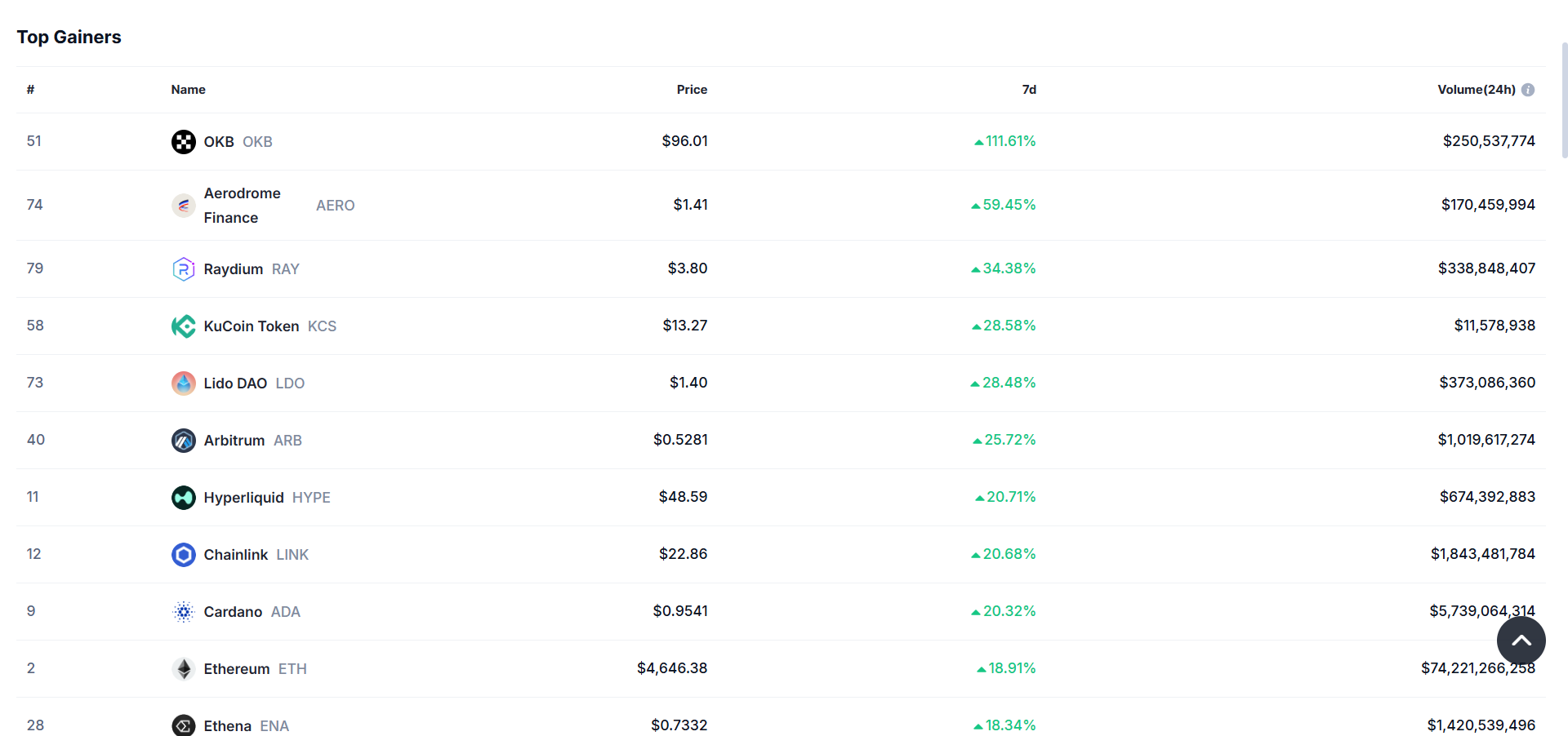 OKB led with a massive 111% jump to $96.01 after OKX announced plans for a one-time burn of over 65 million tokens, cutting its fixed supply down to 21 million. Aerodrome Finance followed with a 59% rise to $1.41, while Raydium gained 34%.