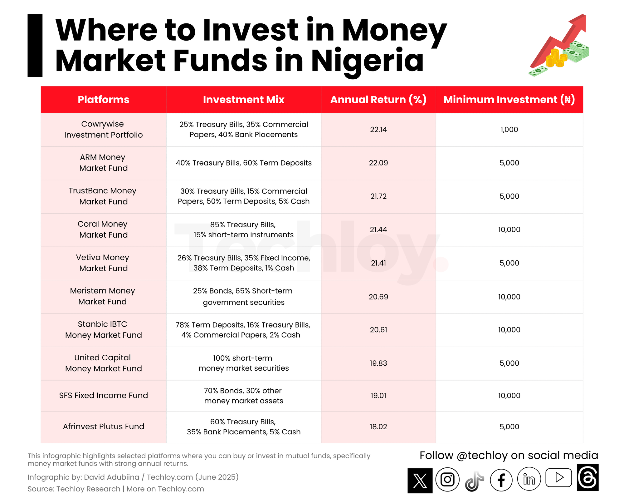 At the bottom of this list, Afrinvest offers 60% T-Bills, 35% in bank placements, and 5% in cash. The structure is still low-risk, but the return—18.02%—has dropped behind most of the others. Could still work if you’re looking for something stable with easy entry, especially if you’re just starting out.