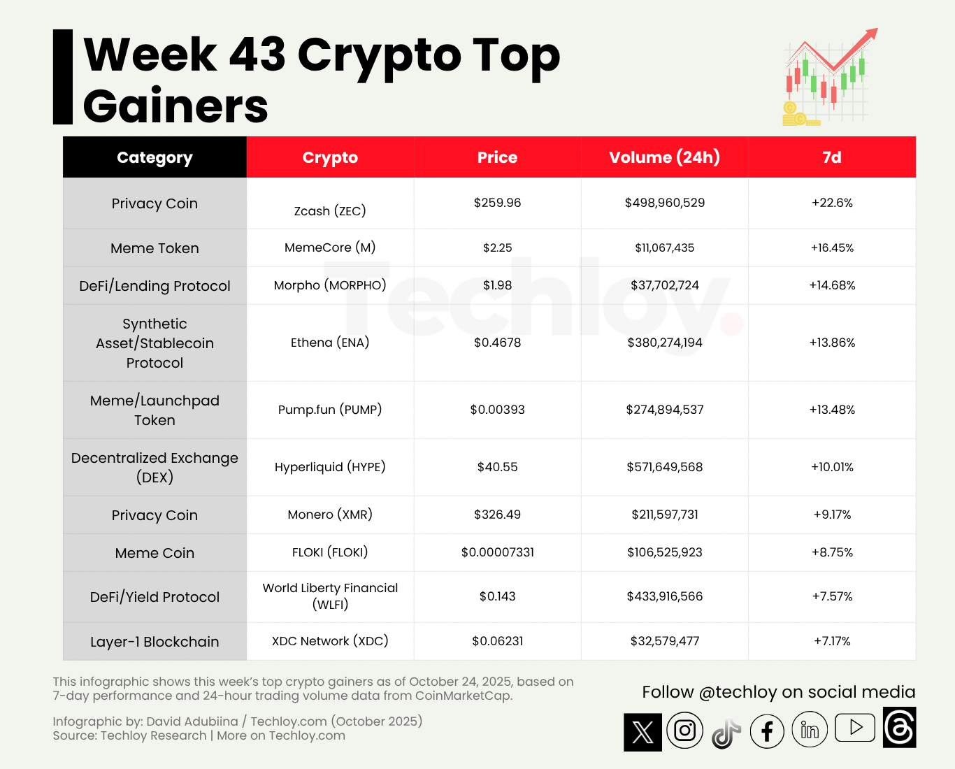 Still, while the macro picture hangs in the balance, a few tokens quietly took the spotlight this week. Zcash (ZEC) led the charge, jumping 22.6% to around $259.96, with nearly $499 million traded in the past 24 hours. It was followed by MemeCore (M), which climbed 16.4% to $2.25 on about $11 million in volume.