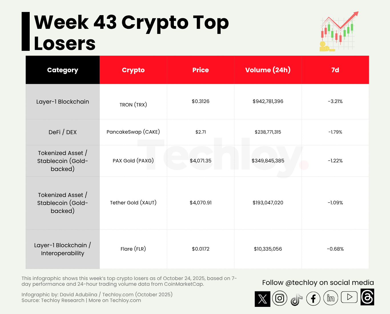 Of course, it wasn’t all gains across the board. TRON (TRX) slipped 3.21% to $0.3126, with a hefty $942 million in daily volume, while PancakeSwap (CAKE) dropped 1.79% to $2.71. Even precious metal-backed tokens also eased slightly, with PAX Gold (PAXG) down 1.22% to $4,071.35 and Tether Gold (XAUT) off by 1.09% at $4,070.91. Flare (FLR) rounded out the top losers, slipping 0.68% to $0.0172 on light volume of just over $10 million.