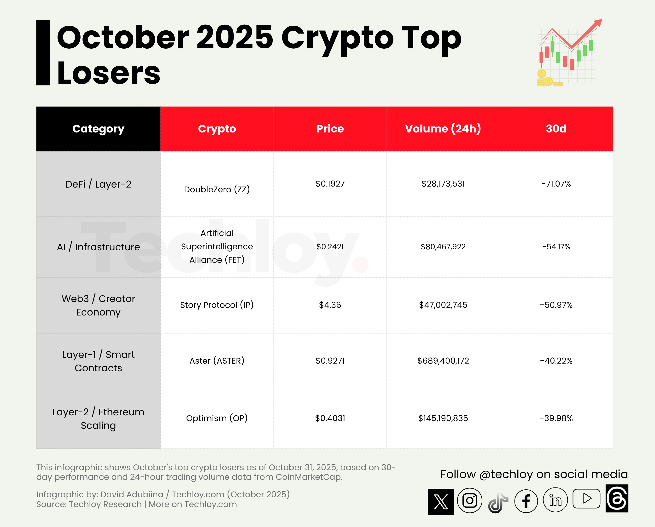 On the flip side, the losers’ column told a very different story. DoubleZero (ZZ) plunged more than 71%, followed by Artificial Superintelligence Alliance (FET), which dropped 54%, reflecting how AI-themed tokens have struggled to maintain their earlier hype. Story Protocol (IP), Astar (ASTER), and Optimism (OP) also slipped between 40–50%, with big names like Avalanche (AVAX) and Worldcoin (WLD) not far behind, both shedding over 35% of their value.