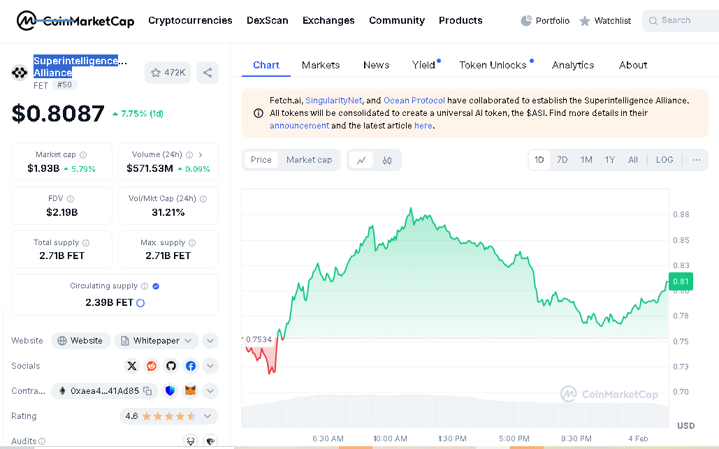 Currently trading at $0.81 with a market cap of $1.94 billion, the Artificial Superintelligence Alliance (ASI) coin is a collaborative effort between leading AI blockchain projects, including Fetch.ai, SingularityNET, and Ocean Protocol.
