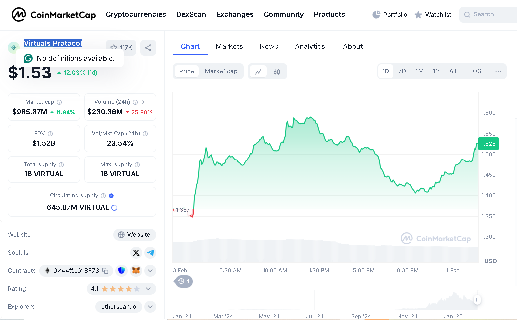 As of now, VIRTUAL is trading at approximately $1.49, with an intraday high of $1.62 and a low of $1.34.