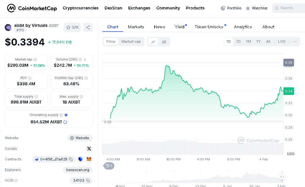 The current price of AIXBT is about $0.3407, with an intraday high of $0.3844 and a low of $0.2863.