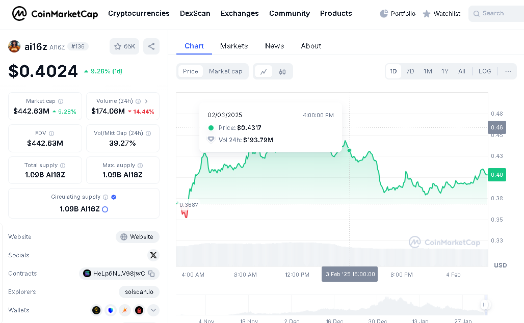 Currently, AI16Z has rebranded to "ElizaOS" and is priced at around $0.4025, with a market capitalization of approximately $441 million.