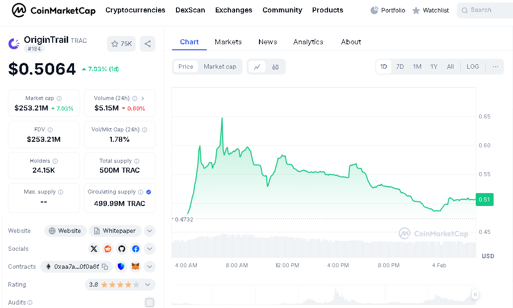 Launched in 2018 as an ERC-20 token on the Ethereum blockchain, TRAC currently trades at approximately $0.4218, with an intraday high of $0.5393 and a low of $0.3875.