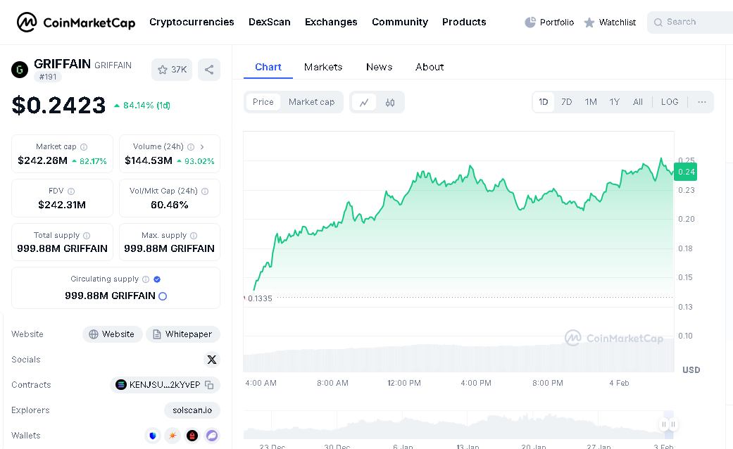 Presently, GRIFFAIN is priced at about $0.2464, with a market cap of $242 million.