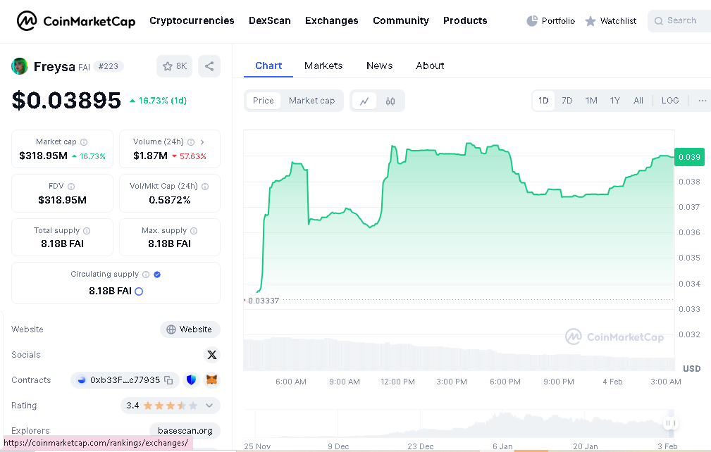 Currently, FAI is trading at approximately $0.0386, with an intraday high of $0.0397 and a low of $0.0328.