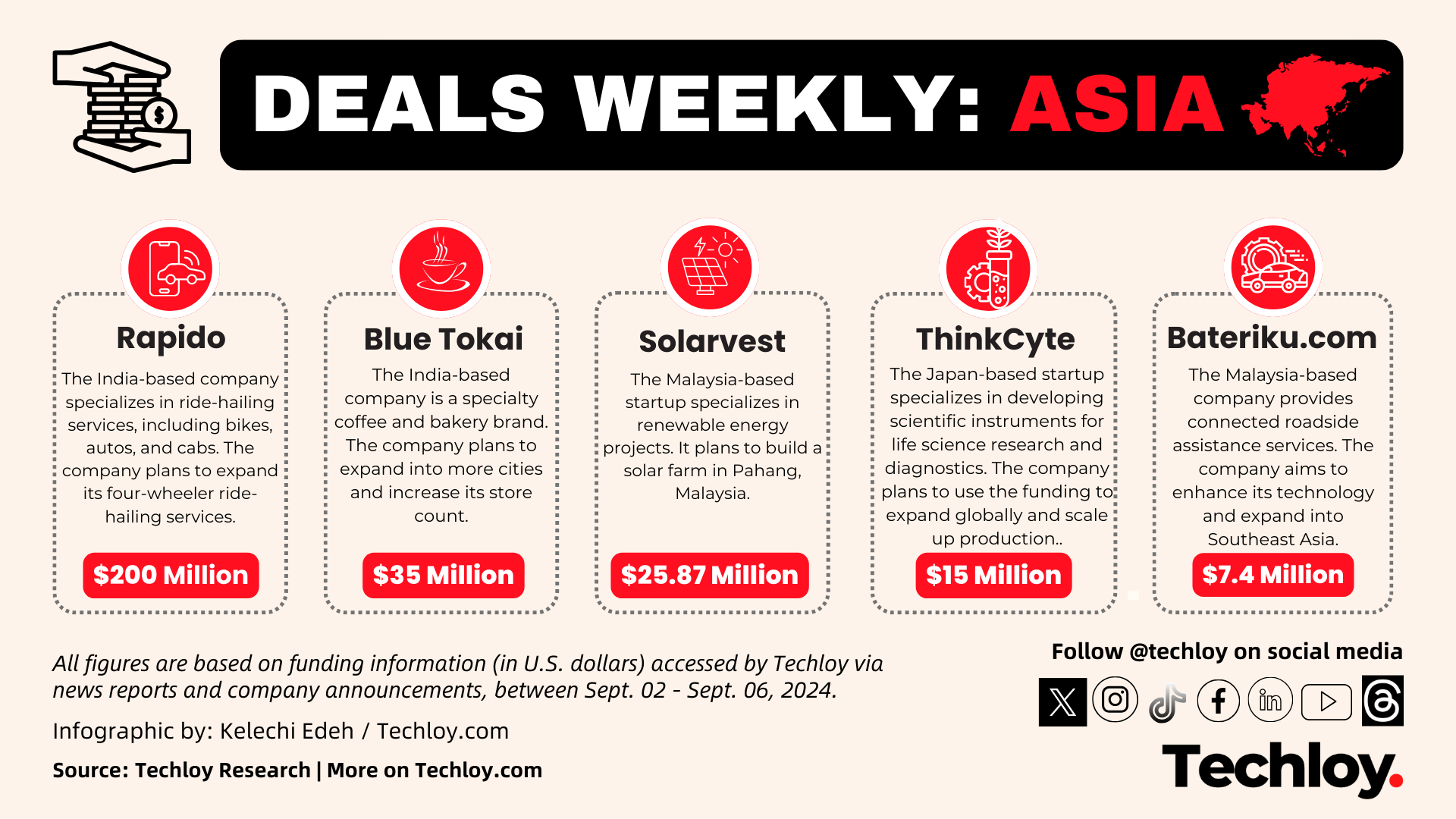 These are the funding deals we tracked in the Asian region this week – including Rapido, Blue Tokai, Solarvest, ThinkCyte, and Bateriku.com.