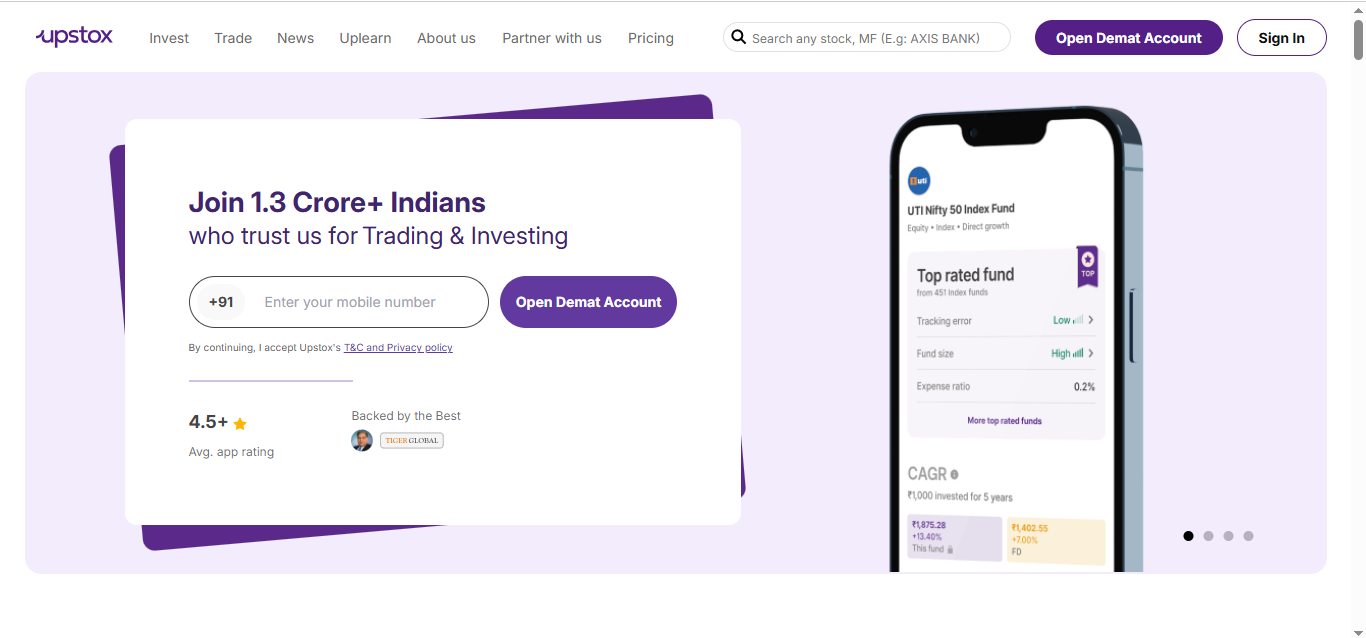 If you’re more into mutual funds or want a simple way to invest in stocks, Groww is a great choice. It has a straightforward interface and a low fee structure, making it a solid choice for beginner investors.