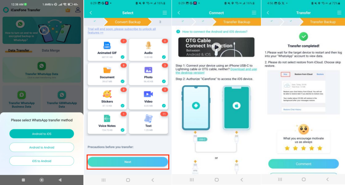 Steps to Transfer WhatsApp from Android to iPhone with iCareFone Transfer App