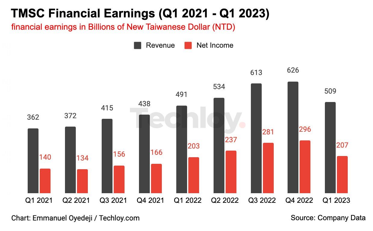 As seen in the Techloy illustration below, the steady climb since the pandemic season plateaued in Q4 2022, and took a nosedive in the first quarter of 2023. Revenue in the quarter fell 18% QoQ from NTD625.5 billion ($20.4 billion) in Q4 2022. Net profit also succumbed to the decline in sales registered in the quarter.