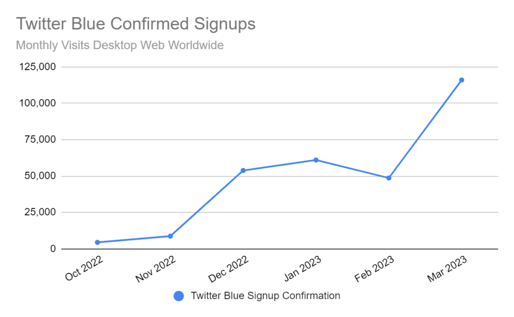 In March, the Twitter Blue signup page recorded 2.6 million visits, with about 116,000 confirmed signups, a 138% growth from the month before, according to Similarweb estimates. This means that the signup conversion from the company's Twitter blue website went up to 4.5% from 2% the previous month.