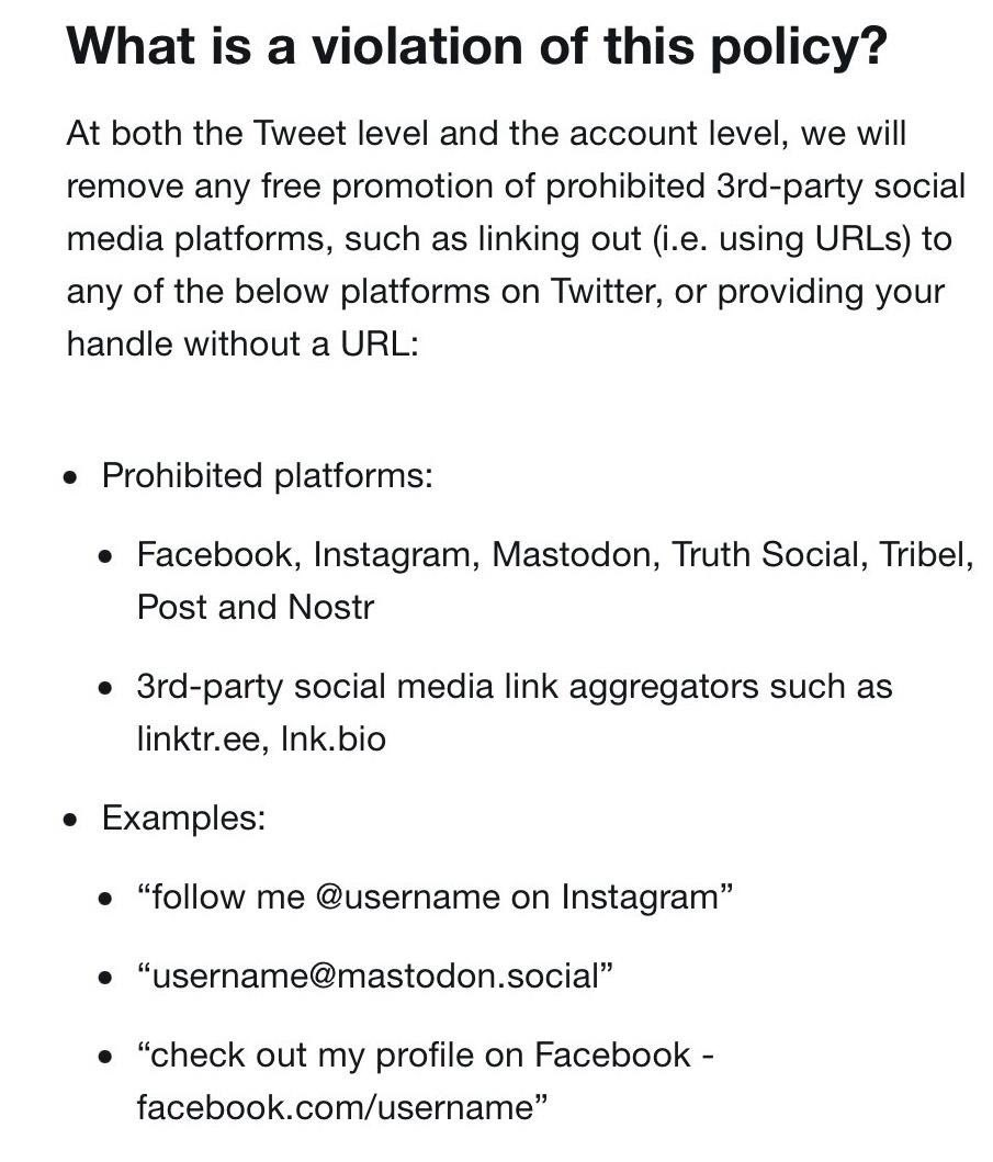 "We recognize that many of our users are active on other social media platforms. However, we will no longer allow free promotion of certain social media platforms on Twitter. Specifically, we will remove accounts created solely for the purpose of promoting other social platforms and content that contains links or usernames for the following platforms: Facebook, Instagram, Mastodon, Truth Social, Tribel, Nostr and Post."